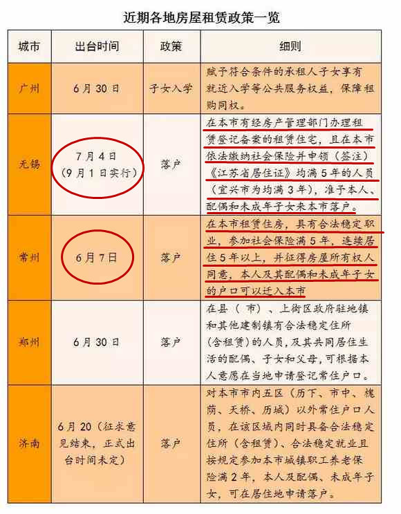 而在今年5月22日,江苏省住建厅下发了关于开展培育和发展住房租赁市场试点工作的通知,其中提到,为大力发展江苏省住房租赁市场,建立购租并举的住房制度,决定选择南京、苏州、无锡、常州、徐州、扬州等城市开展培育和发展住房租赁市场试点工作。目前各城市都相继有了动作,比如苏州有地块土拍要求竞自持,50%只能租赁,70年不能出售;南京被九部委圈定成了住房租赁的首批试点……租房落户会逐渐成为各大城市的标配。