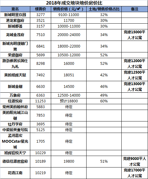 上面两个表格中,笔者罗列了2017年以来所有成交的经营性地块(已有案名)及入市项目,从表格中我们可以看出,近两年以来,常州地价房价占比区间大多在30-60%,且不少高端项目都有竞建人才公寓和安置房,如果剔除这个数据,这个占比会更高。
