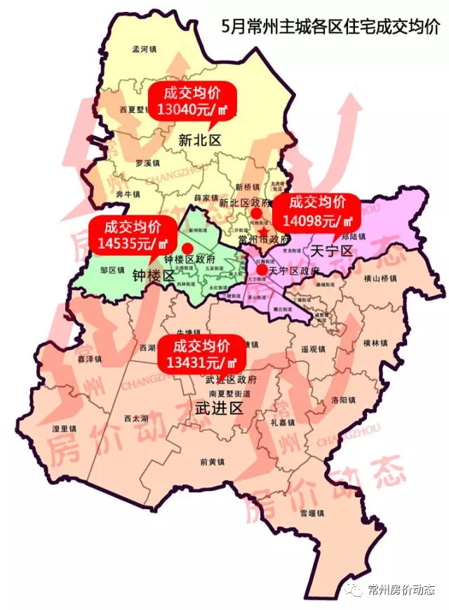 其中,新北区商品住宅成交均价13040元/㎡,武进区成交均价13431元/㎡,钟楼区成交均价14535元/㎡,天宁区成交均价14098元/㎡。钟楼区5月住宅成交均价排名排名前列,其次依次为天宁、武进、新北。