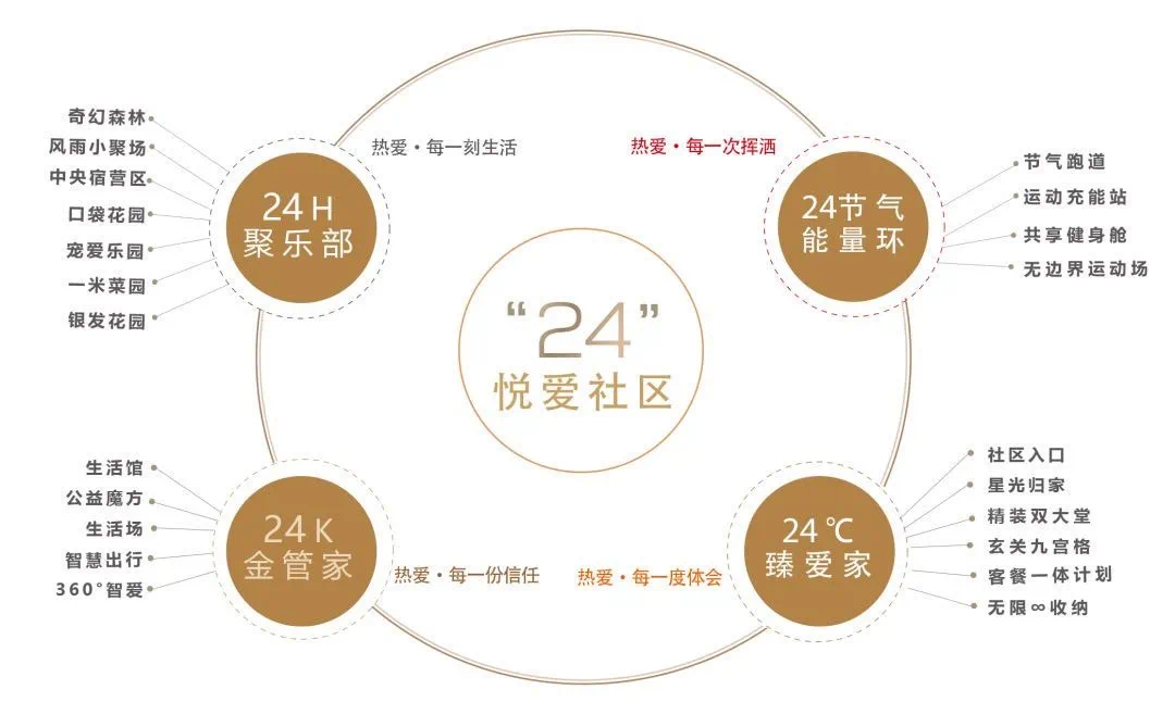 大发地产用热爱凝练时间浓度,更进一步创造出空间密度和情感热度。大发地产将对时间、空间、情感的理解融入到产品中,焕新四大产品线,将“8大悅情景体系”升级为“4大悅居体系”:24H聚乐部、24节气能量环、24℃臻爱家、24K金管家,打造「全时全龄悦居住区」——24悦爱社区。