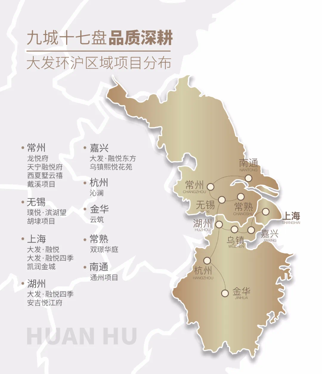作为中国百强上市房企,大发地产成立于1996年,总部位于上海,深耕长三角,重点围绕长三角、成渝、大湾区、中部、环渤海,积极布局全国黄金城市群,项目遍布上海、浙江、江苏、安徽、四川、重庆、广东、江西、河南、青海等全国重要省份,服务3万余户家庭,缔造当地城市标杆。