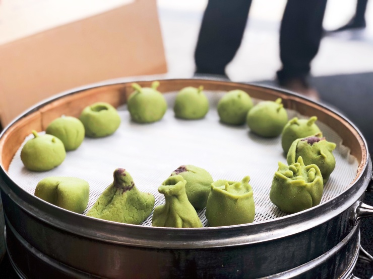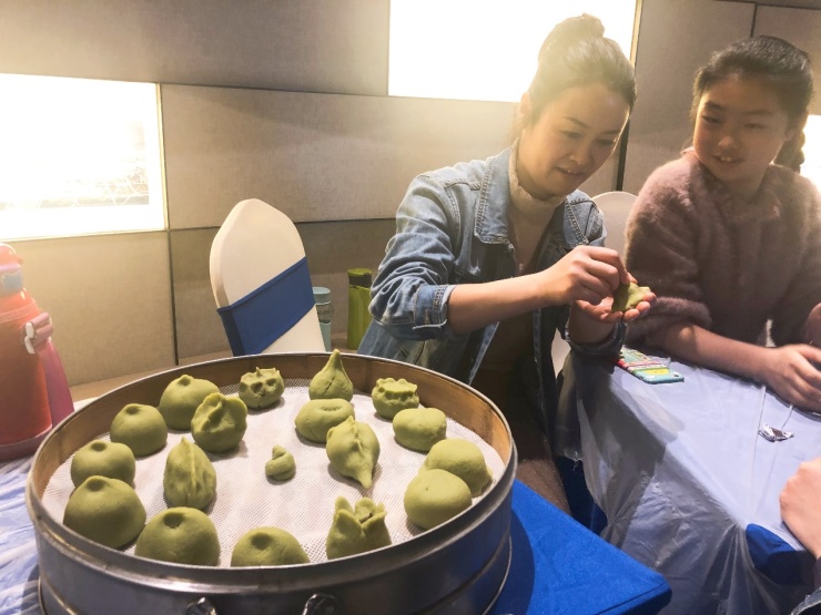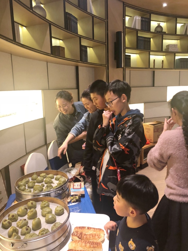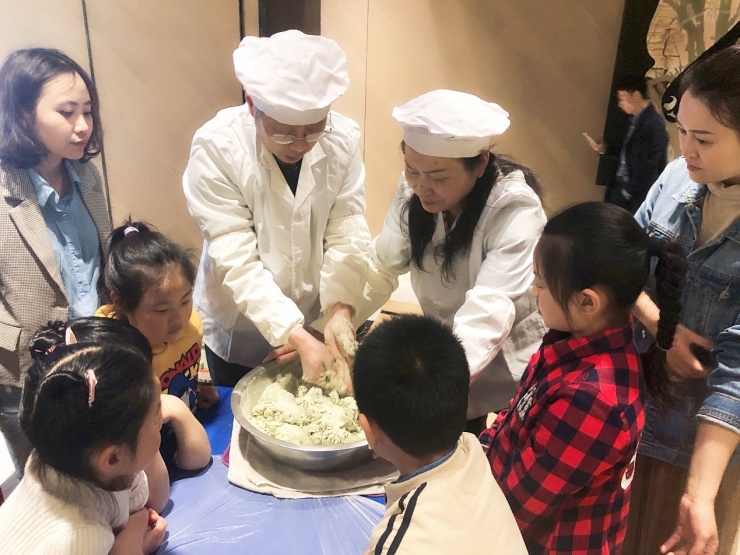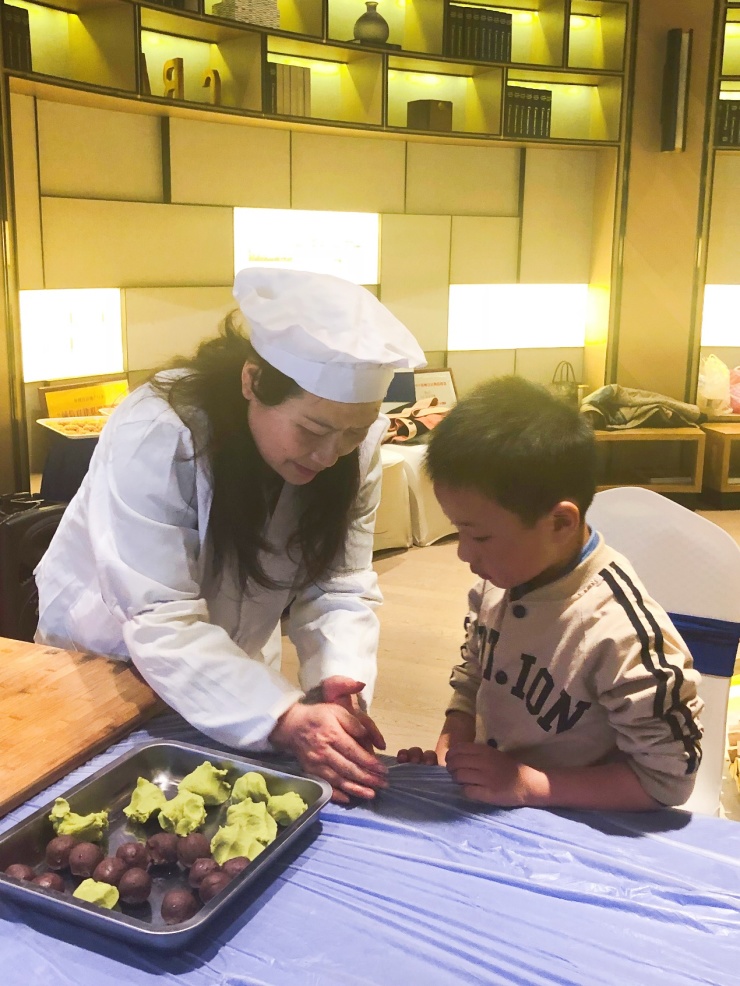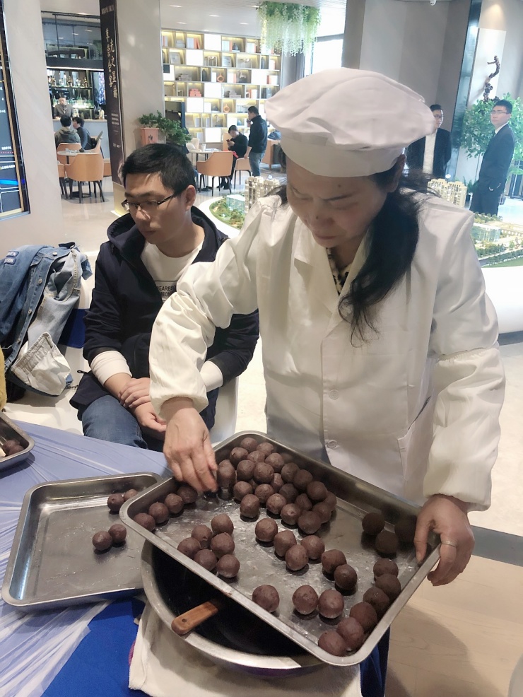 活动现场一片热闹景象,本次手作活动特地邀请了常州德泰恒大酒店从业30年的高级面点师傅孙鲁强亲临现场指导。孙师傅仔细地把材料准备好,捻青、和粉、揉粉、裹馅,一步又一步仔细教给现场来宾。