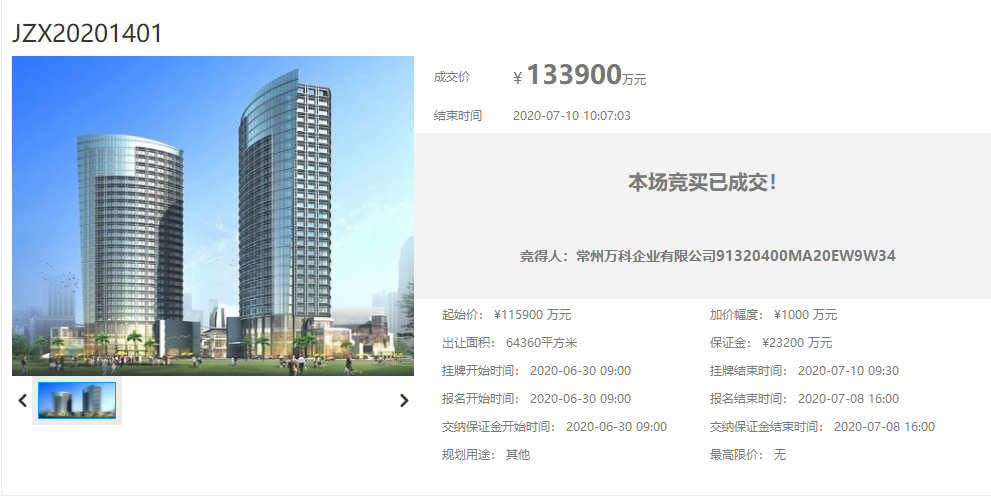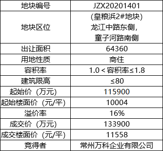 共经历了18轮出价(含限时竞价之前的2轮报价),该地块以133900万元的价格正式成交,竞得房企为万科地产,楼面价11558元/㎡,溢价率16%。