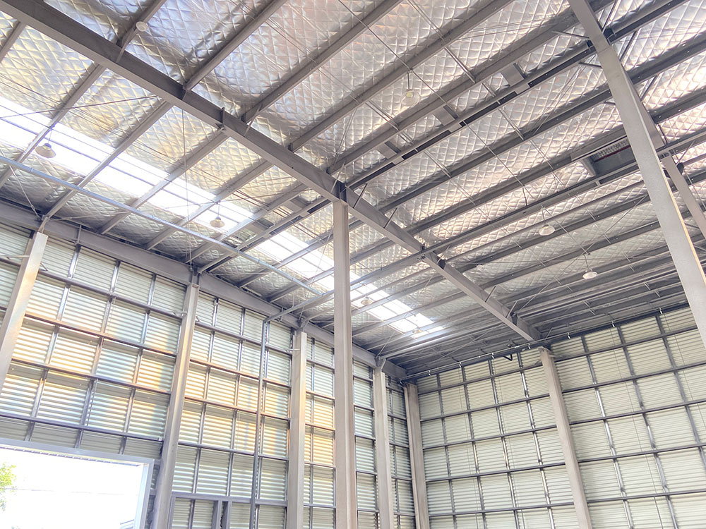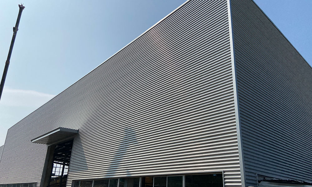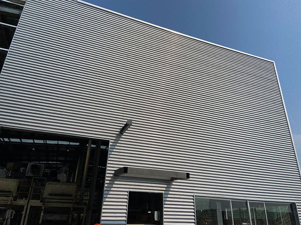 常州市银亮反光新材料有限公司是一家多元化发展的高科技公司,主要从事经营反光材料、交通安全设施以及生产销售等。 厂区占地面积为6300平方米,1#车间和仓库,由广联钢建筑负责建造,2大工程项目均为全钢工程,广联严格按照设计方案,一丝不苟地推进工程建设,深受好评。 1#车间外观设计偏现代简约风 屋面系统