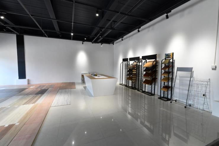 往前则是新材料新工艺的研究区,里面展示的SPC锁扣地板实现了无需任何外部辅助条件下的“自连接”,外观上可以达到密缝拼接,还可以直接铺设于地暖上。无论是导热效果、稳定性能以及踩感的舒适度,在行业内都属先进。
