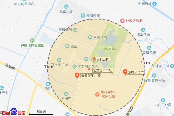 我们参考了这两大地标建筑,以此为核心圈出了1公里范围内的新房项目作为参考。如图可见,在此范围内的仅梧桐香郡东樾与龙城金茂府两大楼盘。并且,经实地走访发现,梧桐香郡东樾与宝龙城市广场仅仅一路之隔,步行至青枫公园南门也十分便捷。