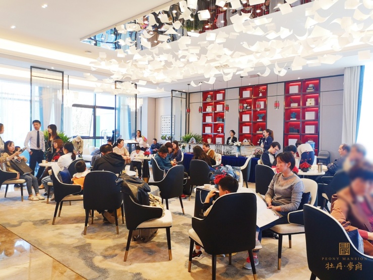 进入牡丹·学府营销中心后,简约而古典的新中式风格让嘉宾们眼前一亮。营销中心的展示围绕“学”和“府”二字展开,强调中华文化底蕴。前厅入口的吊灯,是由汉字的笔划组成的,细节之处体现了黑牡丹的匠心和深厚的人文内涵。