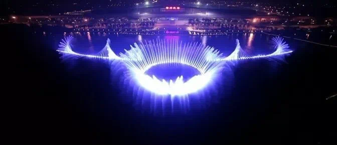 新龙湖音乐公园的音乐喷泉建于2013年,在大型生态水体景观空间中,全长约380米,高雾高达100米,配合了音乐它灵活多变、水型丰富。