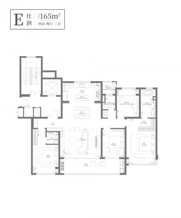 165㎡四室产品,主卧套房设有独立衣帽间、卫浴空间;第二套房设计,方便老人起居;同样拥有餐厨客一体化、独立厨房岛台设计,升级美好生活场景,让居住更加具有生命力。