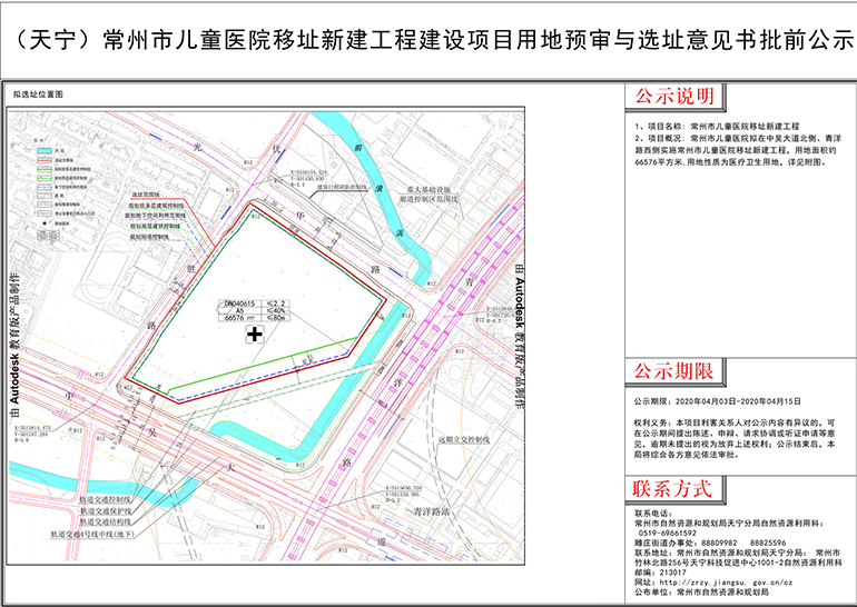 2020年4月3日,常州自然资源和规划局发布了常州市儿童医院移址新建工程建设项目用地预审与选址意见书批前公示,即此前一直热议的常州儿童医院新址已经确定了。