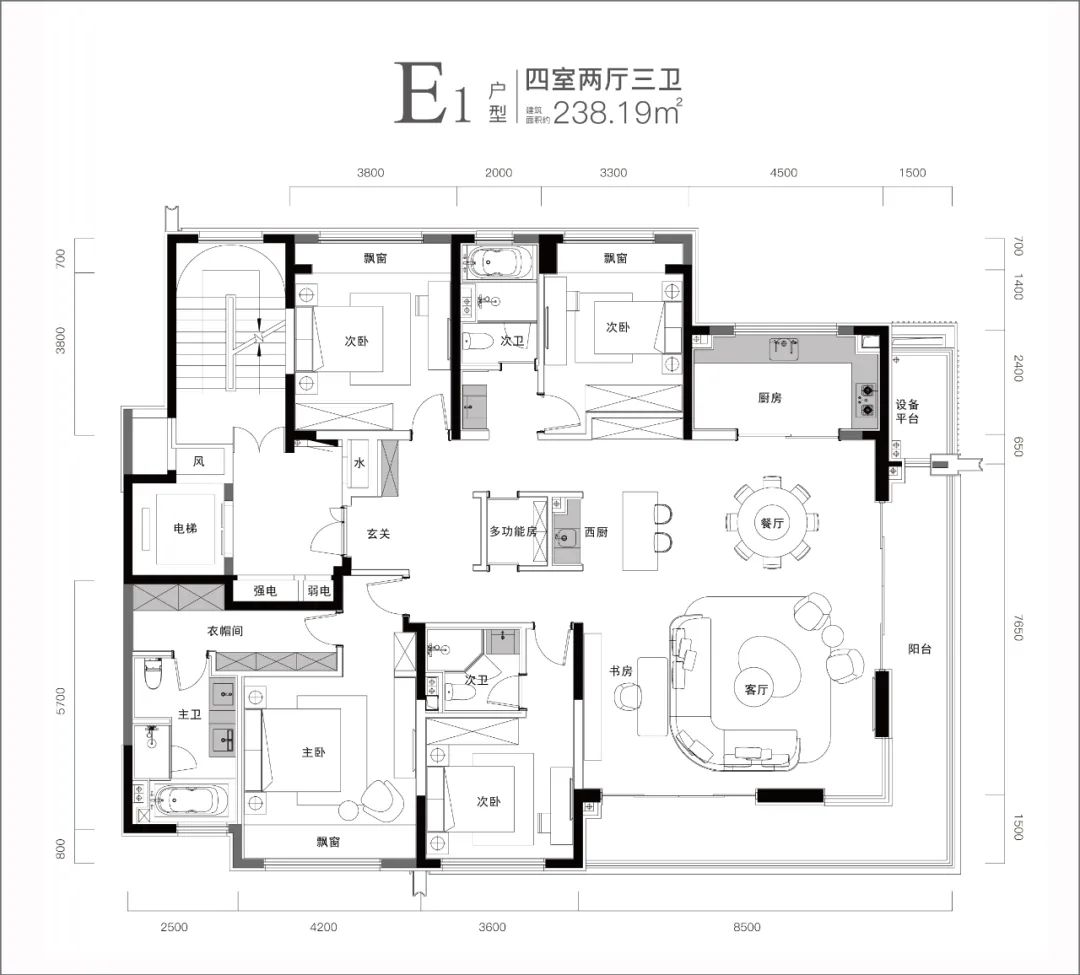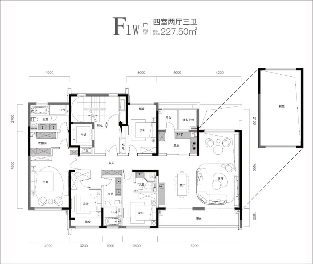 主打的创新户型天空墅值得一看,建面约227.5㎡四室两厅三卫