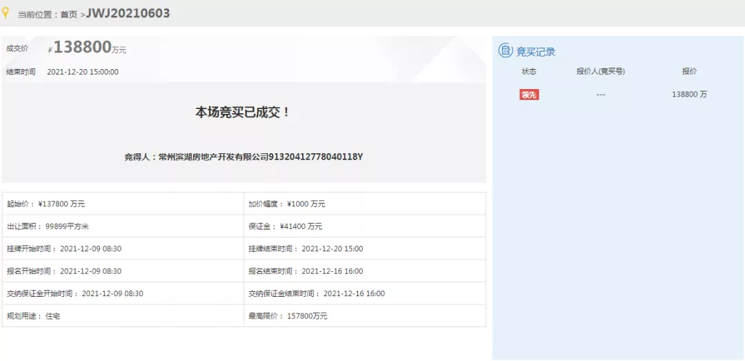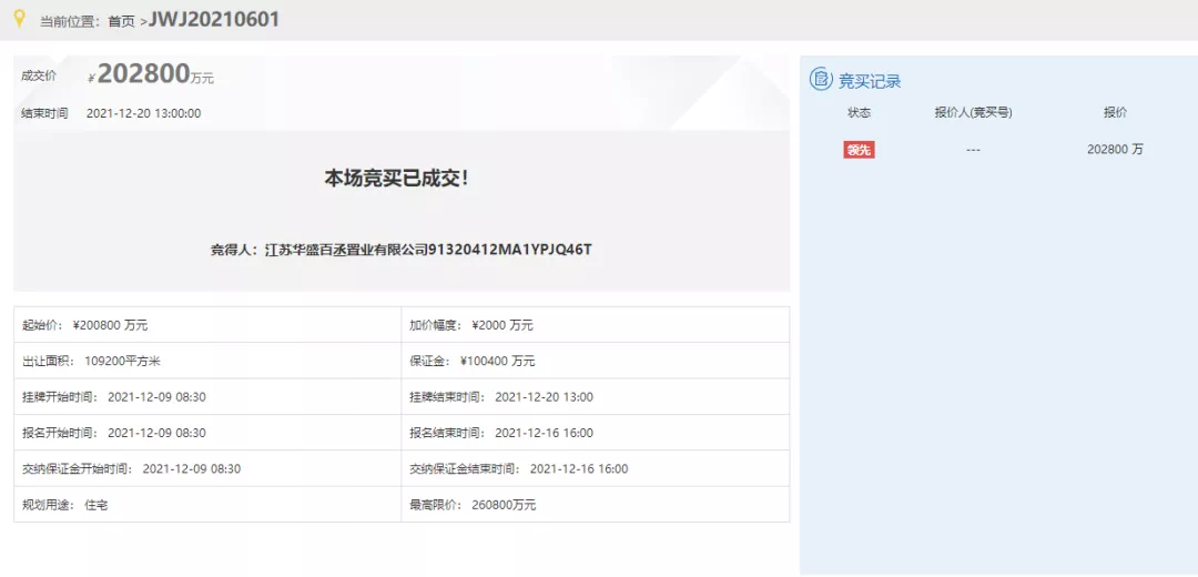 淹城南3号地块今日进行限时竞价,一轮竞拍后,成交楼面价13173元/㎡,成交总价20.28亿元,最终竞得房企为华盛;