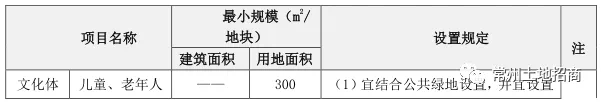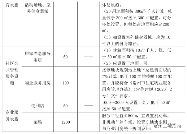 地块内须配置菜场、儿童、老年人活动场地,室外健身器械、居家养老服务用房、物业服务和便利店,具体内容及要求如下表: