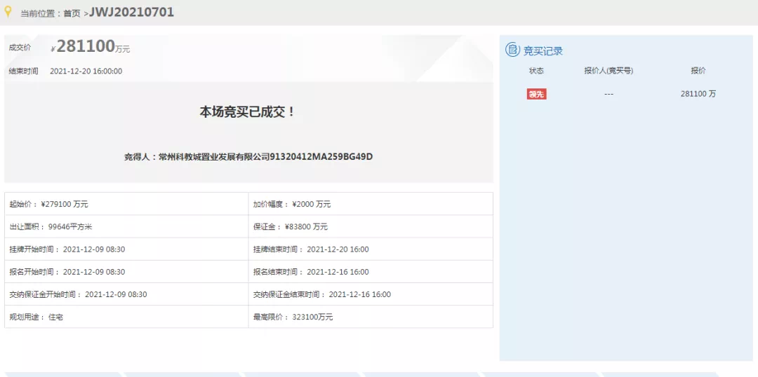 光星地块今日进行限时竞价,一轮竞拍后,成交楼面价14587元/㎡,成交总价27.45亿元,最终竞得房企为龙控;