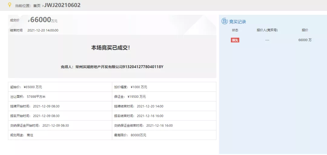 星湖广场东地块今日进行限时竞价,一轮竞拍后,成交楼面价7532元/㎡,成交总价6.6亿元,最终竞得房企为滨湖建设;