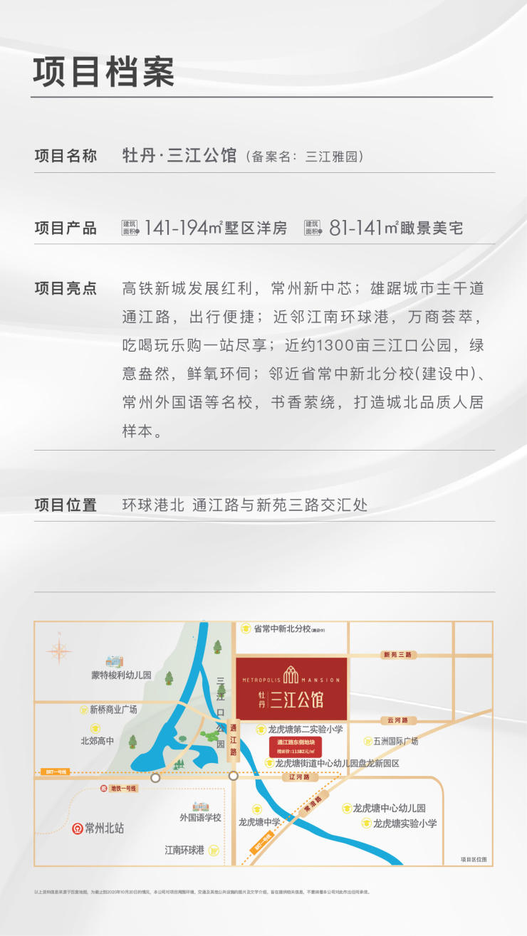 1.本项目推广名为“牡丹·三江公馆”,核准地名为“三江雅园”(或备案名以地名办批复为准),开发公司为:“常州牡丹瑞都房地产有限公司”。