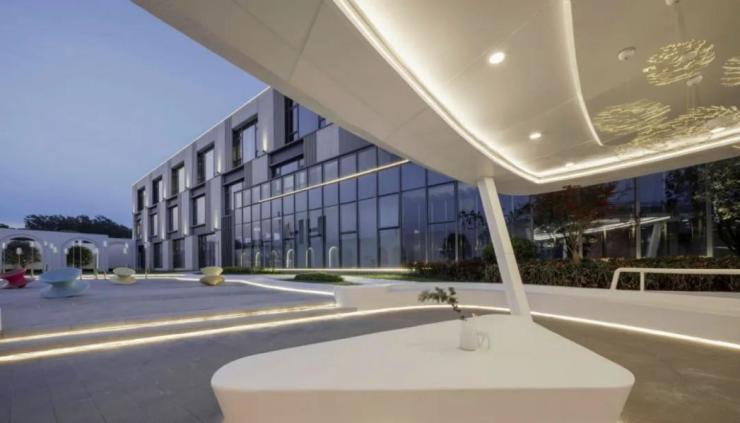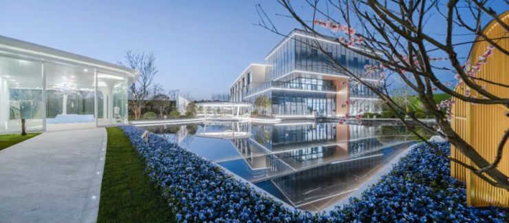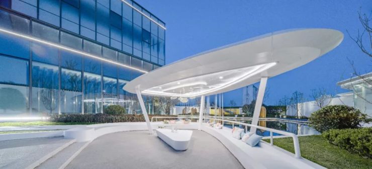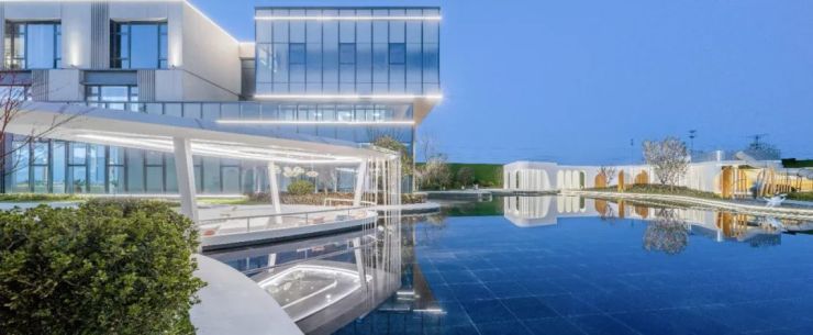 亲水下沉洽谈区提供了一个休憩、回味的空间,干净简约的几何线条,清透的水面映衬着夜色,呈现更为轻盈通透的界面,充满了艺术感与未来感。