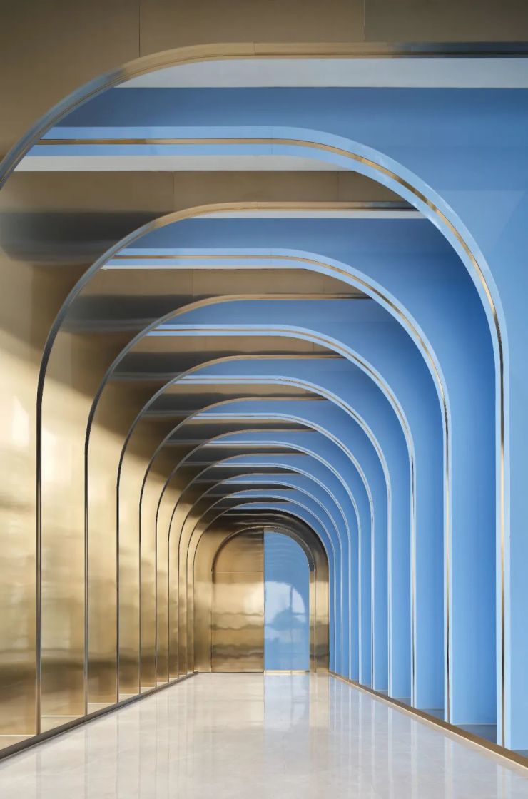 不同于传统空间的制式,门厅以沉静的蓝色与柔美的金色作为主色调,层层递进、虚实交织,以独有的韵律性与节奏感开启着对梦境的探索。