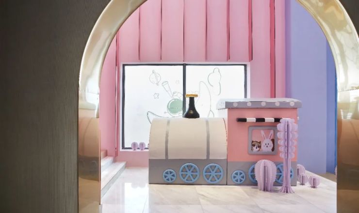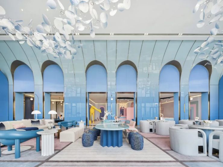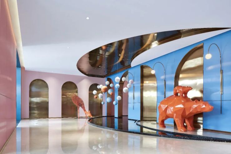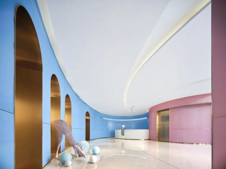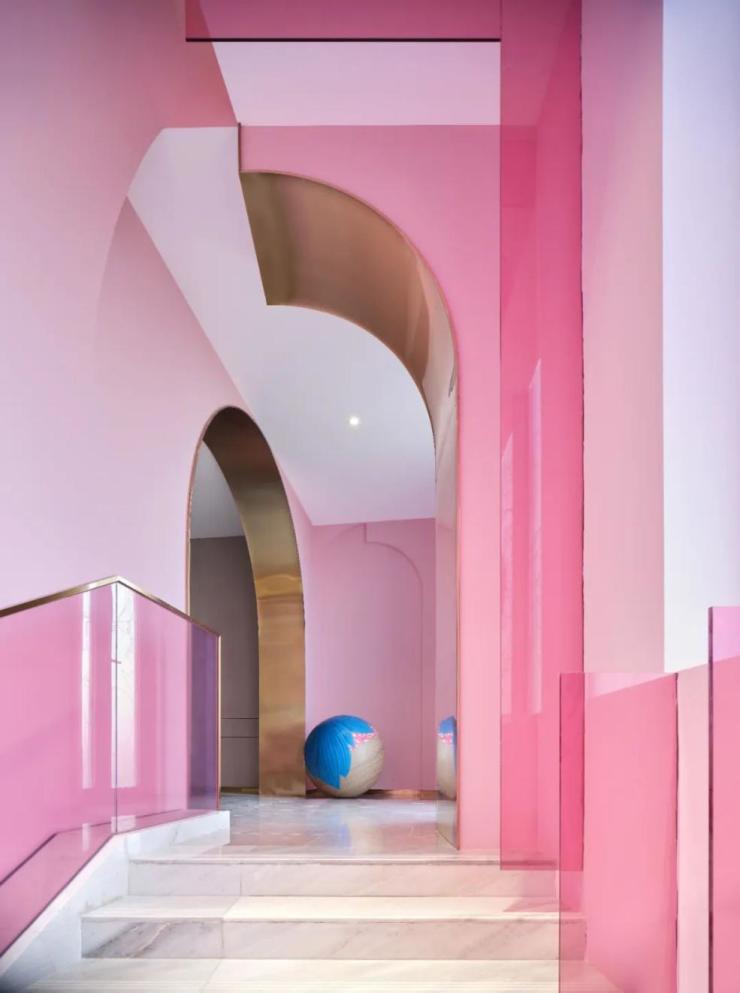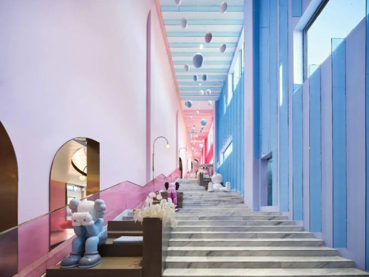 一个连接现实与幻想的阶梯,蓝色与粉色块面穿插,如同打翻了马卡龙的颜料盘,整个区域相互渗透、相互重叠,带来一段沉浸式梦幻之旅。