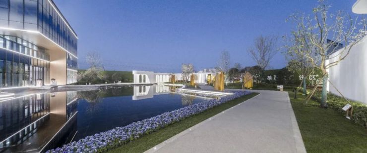 大尺度的水景空间萦绕,两侧互动的格栅门散落在绿植之间,空间灵动而妙不可言。温柔的夜色下,是动静相宜的场所记忆。