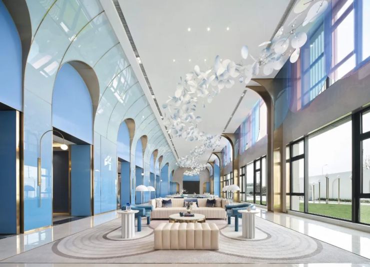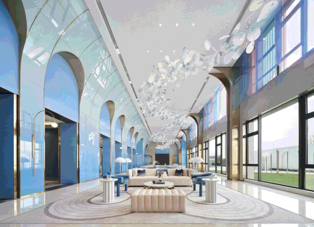 空间到此悉数展开,室内宽敞明亮,多重灵动的弧线与静雅的蓝色形成一种戏剧化的对比,灵动的线条仿佛漂浮的流云,将美轮美奂的场景赋予极大的趣味性。