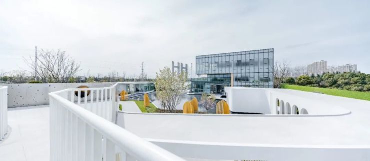 登上二层,站在一个干净简约的露台上,大片景色尽收眼底,童趣滑梯的安装在玩乐之间又能回到互动装置旁,乐趣无限。