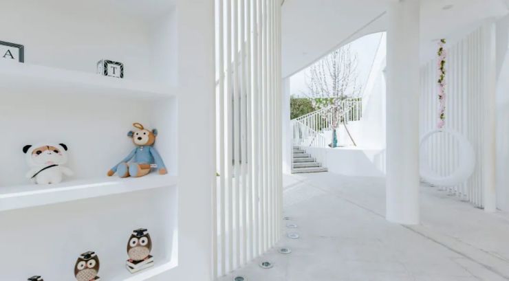 缓缓步入,可以看到一侧摆放了精巧可爱的孩童玩具,另一侧则是拾级而上的台阶,通过长廊场景的转换,创造更多丰富的空间形态。