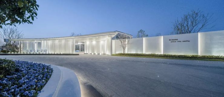 现代简约风格的白墙搭配绿植,以大尺度简洁手法打造横向延展视觉感受,简约线条带来亲切近人、轻巧通透的舒适视觉,成为空间序列的起点。