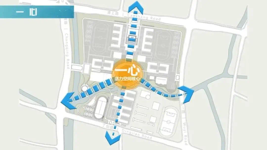 一心:四校区活力空间、两带为运动主题景观带和休闲主题景观带
