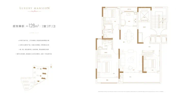 建面约128㎡为三房两厅两卫,属于小高层主力户型,户型方正,全明通透,三开间朝南,功能分区明确,餐客厨联通布局,动线清晰。