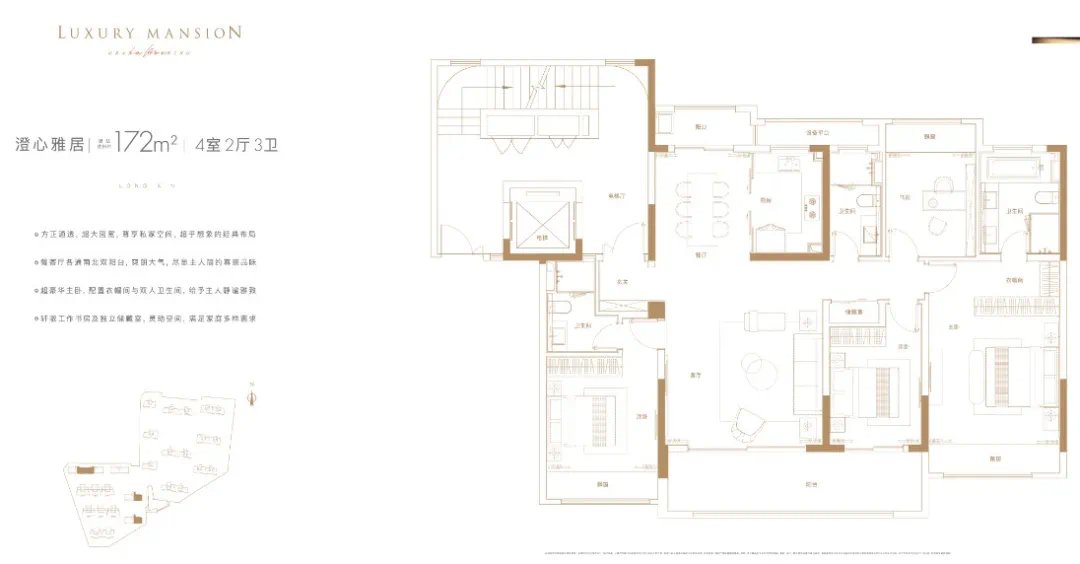 约172㎡四房两厅三卫,洋房户型,方正通透,超大面宽,餐客厅各通南北双阳台,爽朗大气,轩敞工作书房及独立储藏室,灵动空间,满足家庭多样需求。