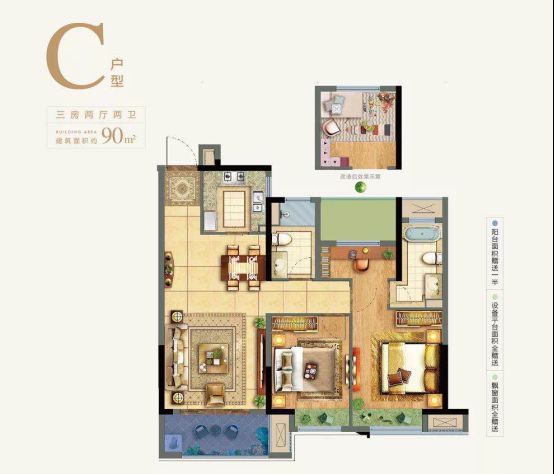 建面约90㎡三室两厅一卫户型,空间利用率极高,为经典方正户型,三开间朝南,全明客厅,客餐厨一体化设计,宽敞气派,实现多空间联动,主卧套间设计,超大瞰景阳台,开拓视野极限,纵享少有四季美景。