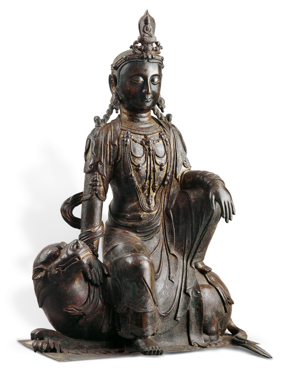 狮吼观音(梵文Simhananda),吼为传说中的龙生九子之一,是较少见的一种观音密教形式。此尊是观音菩萨骑在狮子身上的形象。观音菩萨表情慈祥静穆,菩萨装束,头戴宝冠,上身袒露,呈舒坐”。整体造型姿态生动自由,装束衣纹流畅,狮子的动态夸张,肌肉饱满,鬃毛刻划丝丝入扣,一丝不苟。体量硕大,铸造精美,保存完整,在同时期的造像中较为罕见,堪称元代工艺美术精品。