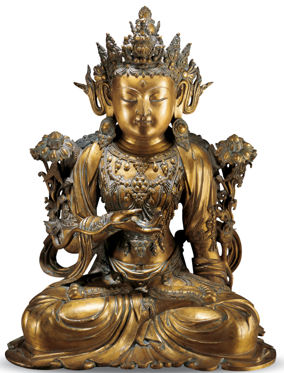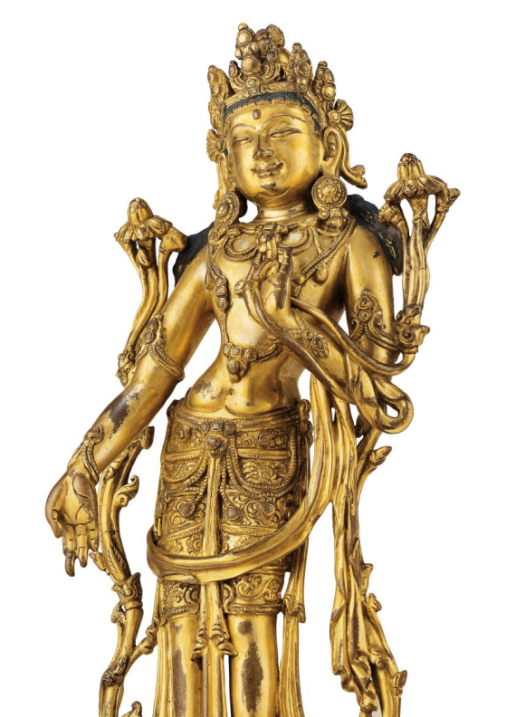 莲花手观音是观世音菩萨众多化身之一,因手执莲花而得名,此尊左右肩部各生一莲,较为罕见。此像造型优美,比例匀称,集金厚重。制作精细,细部刻划富于表现力,所佩璎珞、所戴花冠等尤为华美,应为明代宣德时期宫廷佳作。