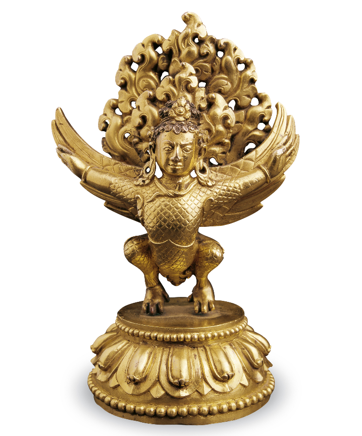 大鹏金翅鸟,梵名迦楼罗,是佛教重要护法神,为天龙八部之一。据说他专以龙为食,是龙类的克星,后被佛教吸收为护法神。此像人面鸟身,开脸饱满圆润,双臂奋力展开,似展翅欲飞状,其凝神屏息之态呼之欲出,大有“以清净眼”观察世人之态。