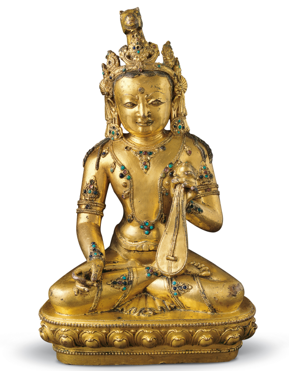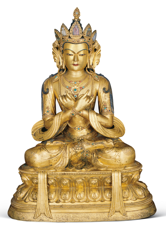 此像是康熙时期宫廷御制佛像,呈现的是他为释迦佛宣说密法时的形象,又称本初佛。此尊铜质精良厚重,整体鎏金完好,工艺精湛。头戴五叶宝冠,镶嵌水晶、玉、哥瓷、宝石、琉璃,中间嵌红珊瑚、绿松石等。神态肃穆,似有所思。璎珞处嵌青金石、松石、珍珠、珊瑚、华丽富贵。整尊造像体形比例匀称,金刚双手在胸前交叉。十指如兰,灵动有致。束腰式仰覆莲瓣饰卷云纹。衣裙,帔息及莲花座最下沿錾刻缠枝莲纹,一丝不苟,细致入微。