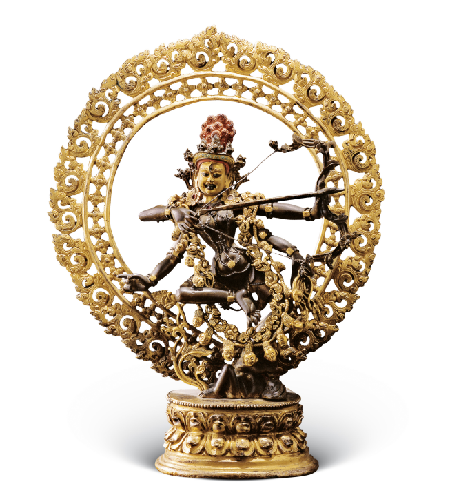 智行佛母藏语名“咕噜咕力”,意即智行。按佛经描述,此尊智行佛母为愤怒相。本尊三目怨睁。赤发上冲,蹙眉。龇牙外露,体态匀称写实,腰系虎皮裙,做工精美,工艺复杂。造像身躯部分呈紫金铜色,缨络为银制。且有纯金点缀。工艺复杂精细,保存优质,无以复加。