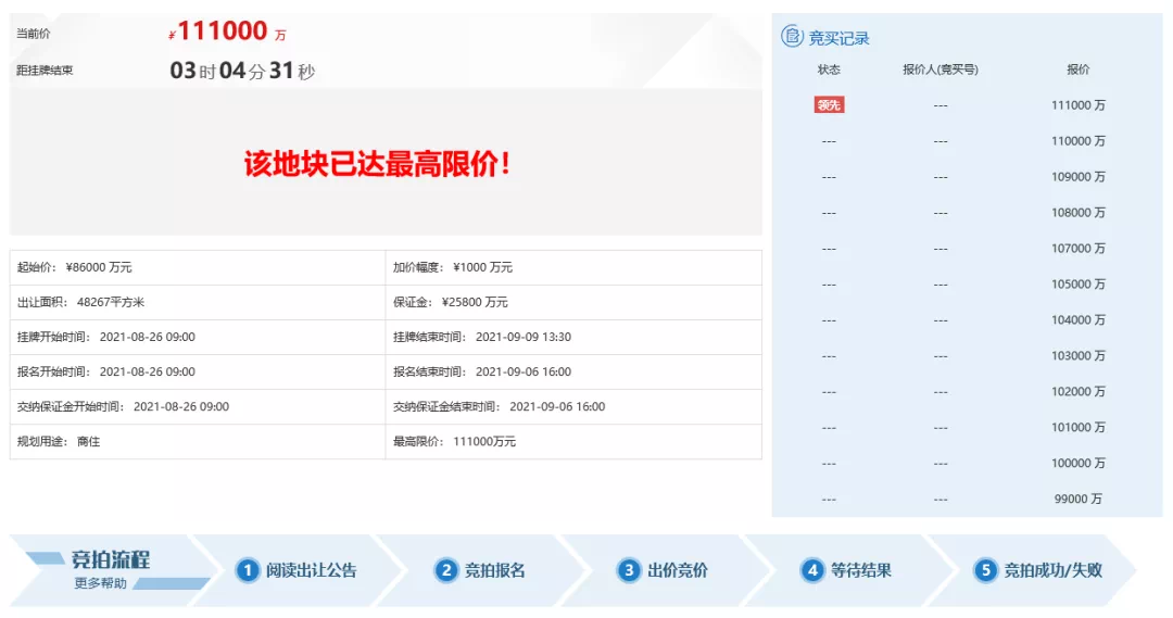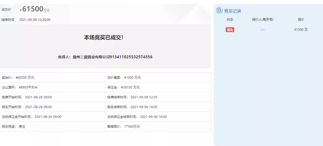 此前五环纸业地块竞价1轮,成交楼面价6160元/㎡;最终竞得房企为三巽;